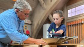 Tom works with a young woodworker to set up a kids' workshop in her father's garage.