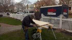 Tom repairs a broken board on a front porch. Scott uses crown molding to conceal wiring.