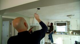 Richard quiets a noisy heating system. Electrician Scott Caron installs recessed cans.